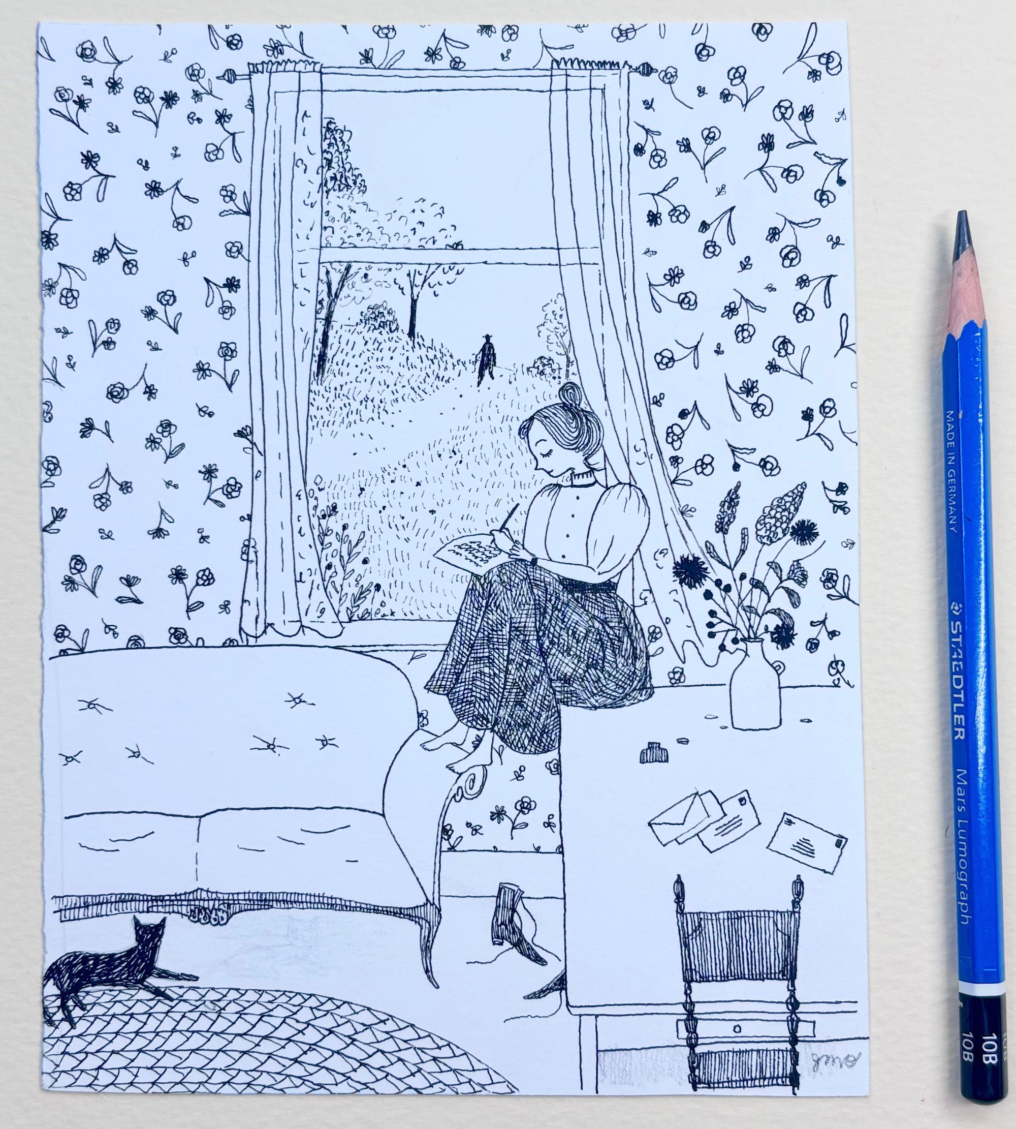 Small original ink drawing from the book " House of Dreams -the Life of L.M. Montgomery" , written by Liz Rosenberg Pen and Ink on paper 18x14 CM approx.